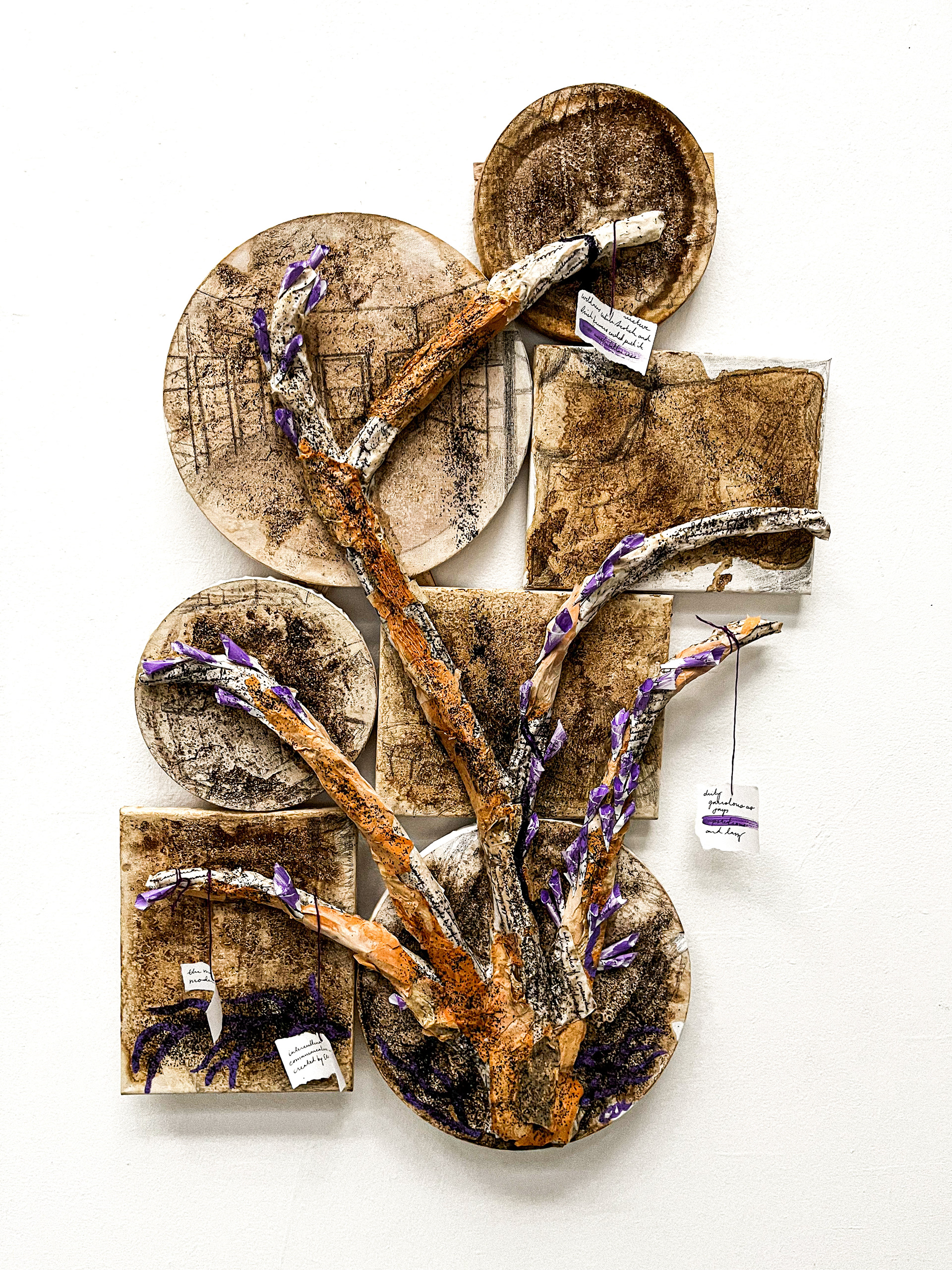 Inspired by the archives of Geisel Library and the modern landscape of the University of California, San Diego. This mixed media piece explores the relationship and history between the University of California and the American military and its effects on the natural landscape. Charcoal pencil, coffee grounds, whiskey, paper bark tree shavings, paper and twine on canvas.